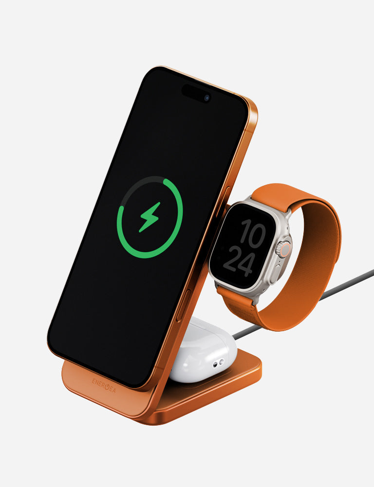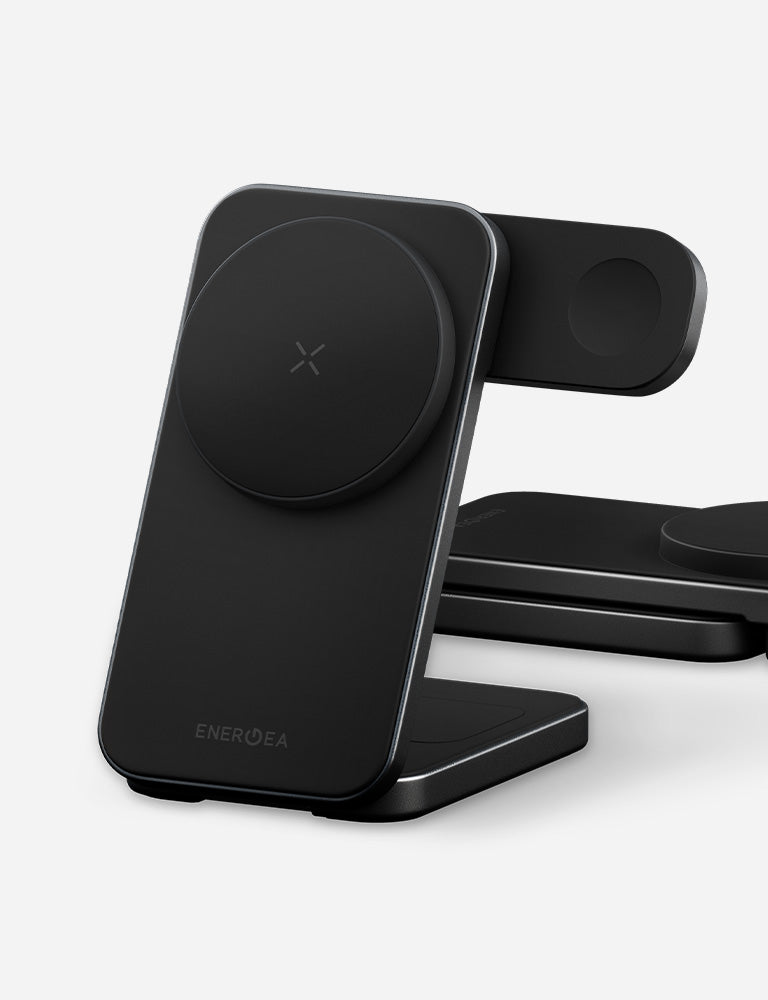 Ultra Portable Qi2 25W Certified Foldable 3-in-1 wireless charging station combines the power of triple wireless charging with the convenience of hands-free magnetic attachment. Designed for iPhone 12 series and above. The stand also features sliding Watch Charger for Apple watch.