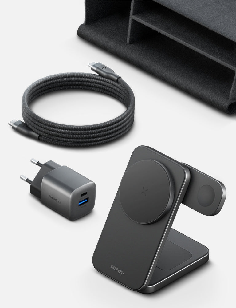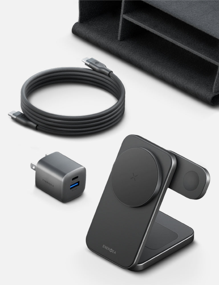Essential Kit is curated for an active and on-the-go lifestyle. The kit comprises of MagTrio Plus (3 in 1 wireless charger), AmpCharge GaN35 and Helix for a complete powerhouse to maximize your journey experience. A travel pouch is included to enhance the storage purposes for any trip you embark on.