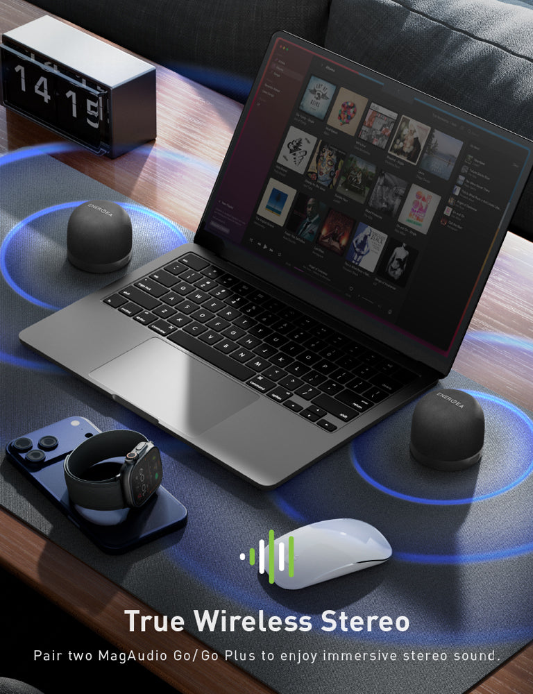 Bring your music wherever life takes you with the MAGAUDIO GO PLUS. It delivers immersive sound in a compact, wireless magnetic speaker that wirelessly charges your phone when plugged into a charger. Its built-in battery offers up to 15 hours of music playback for uninterrupted listening on the move.