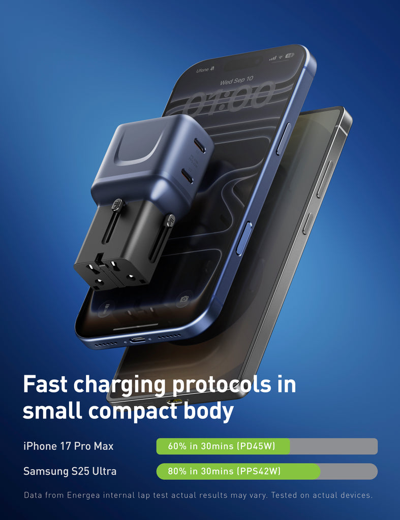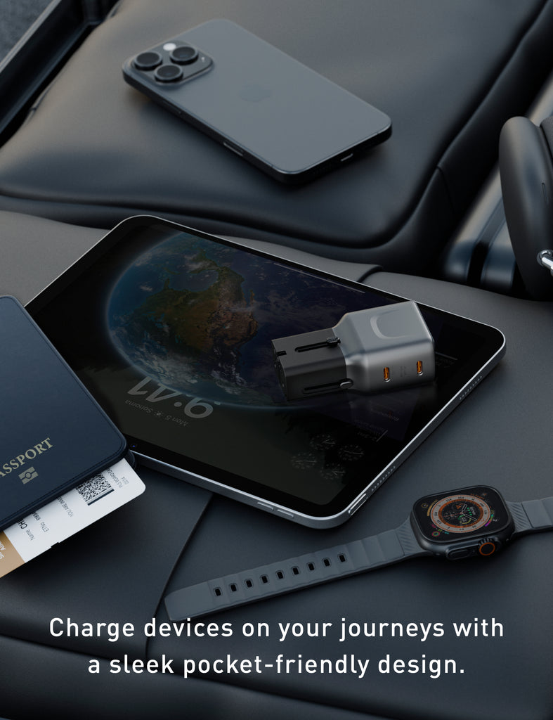 This ultra-compact 45W PD travel adapter features interchangeable plugs and dual USB-C ports, making it easy to charge your devices anywhere in the world. Lightweight and travel-friendly, it's the perfect companion for your next international adventure.