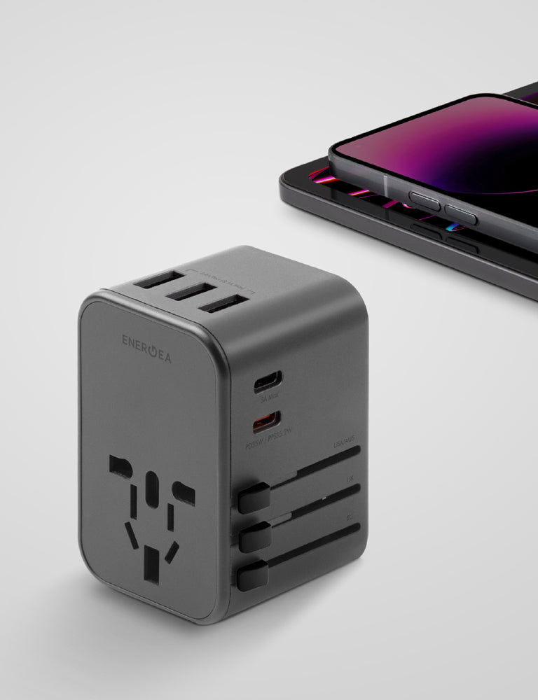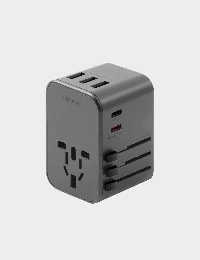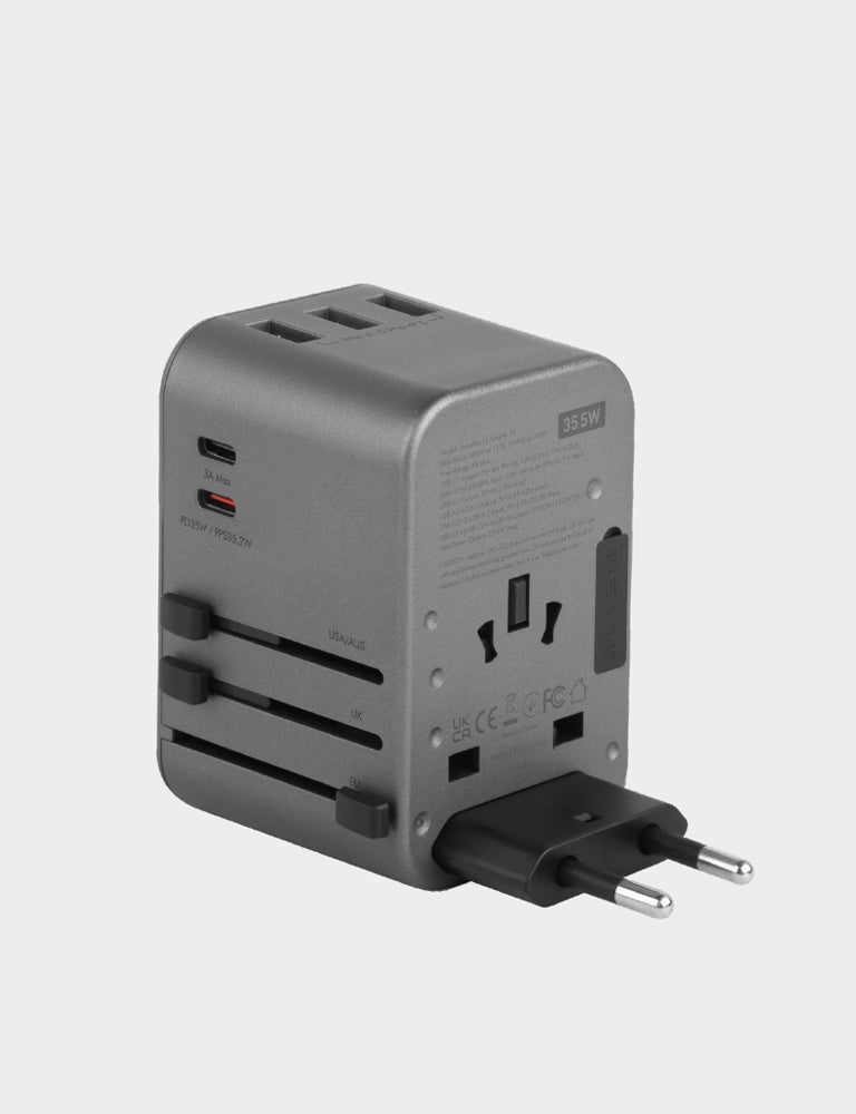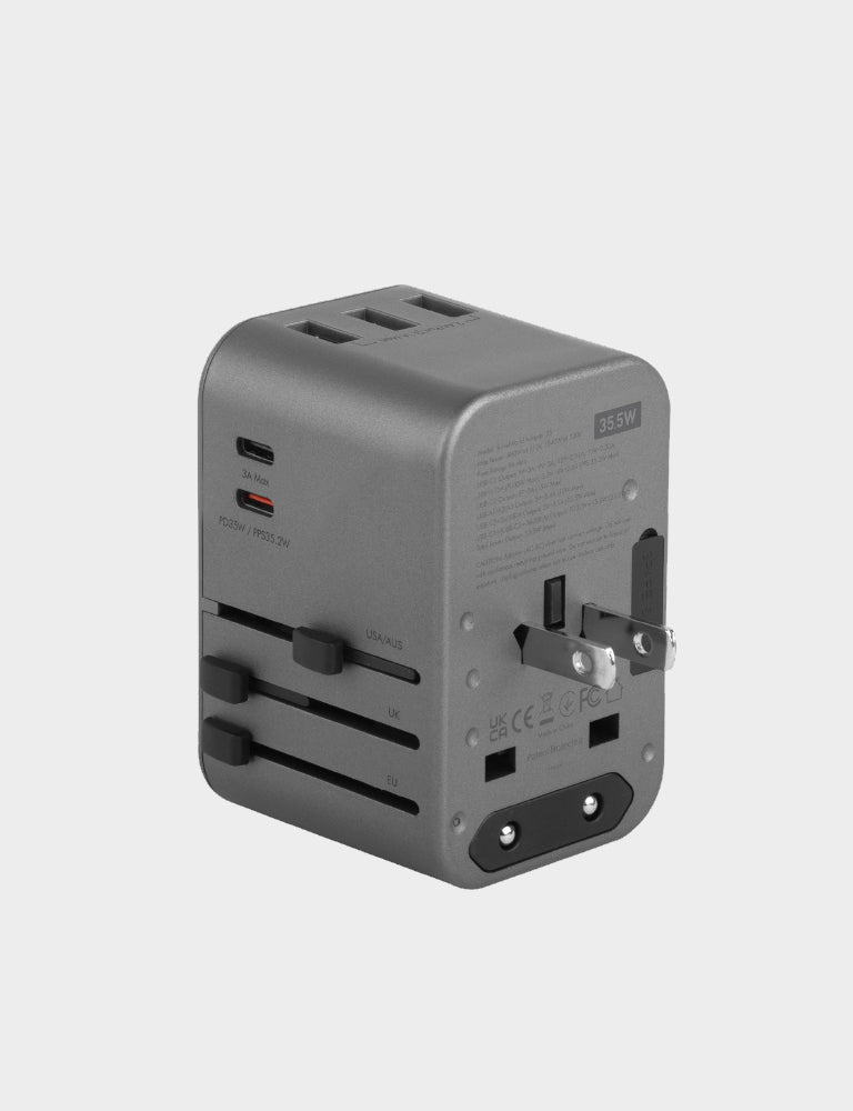 - 2 USB-C + 3 USB-A travel adapter with US/UK/AU/EU/Asia compatibility