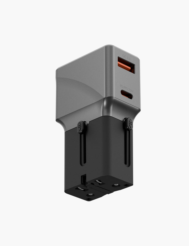 Ultra-Portable PD25W Travel Adapter with Interchangeable Plugs, featuring USB-C and USB-A ports to power up your essentials.