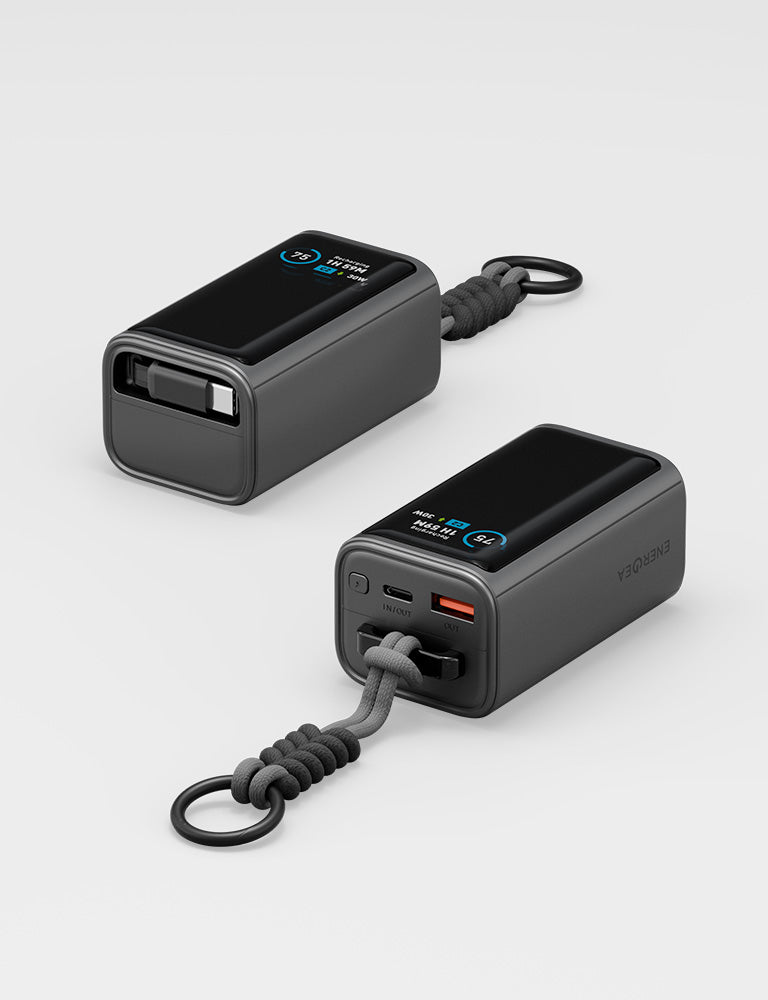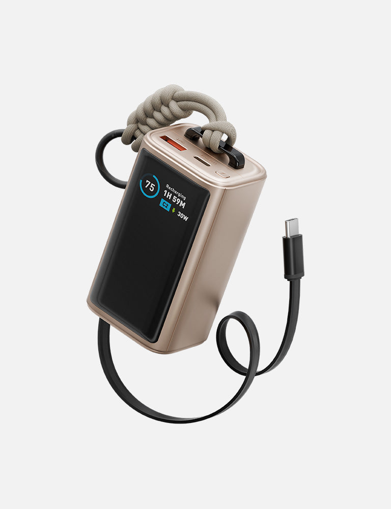 The ComPac Arc 45 is your new sleek, travel-ready companion that keeps the power flowing without weighing you down. With a 10,000mAh battery and PD45W fast output, it charges your devices swiftly. Designed for life on the move, it features a built-in 70cm retractable USB-C cable, a smart digital display for instant status checks, and a braided lanyard so it clips securely to your bag.