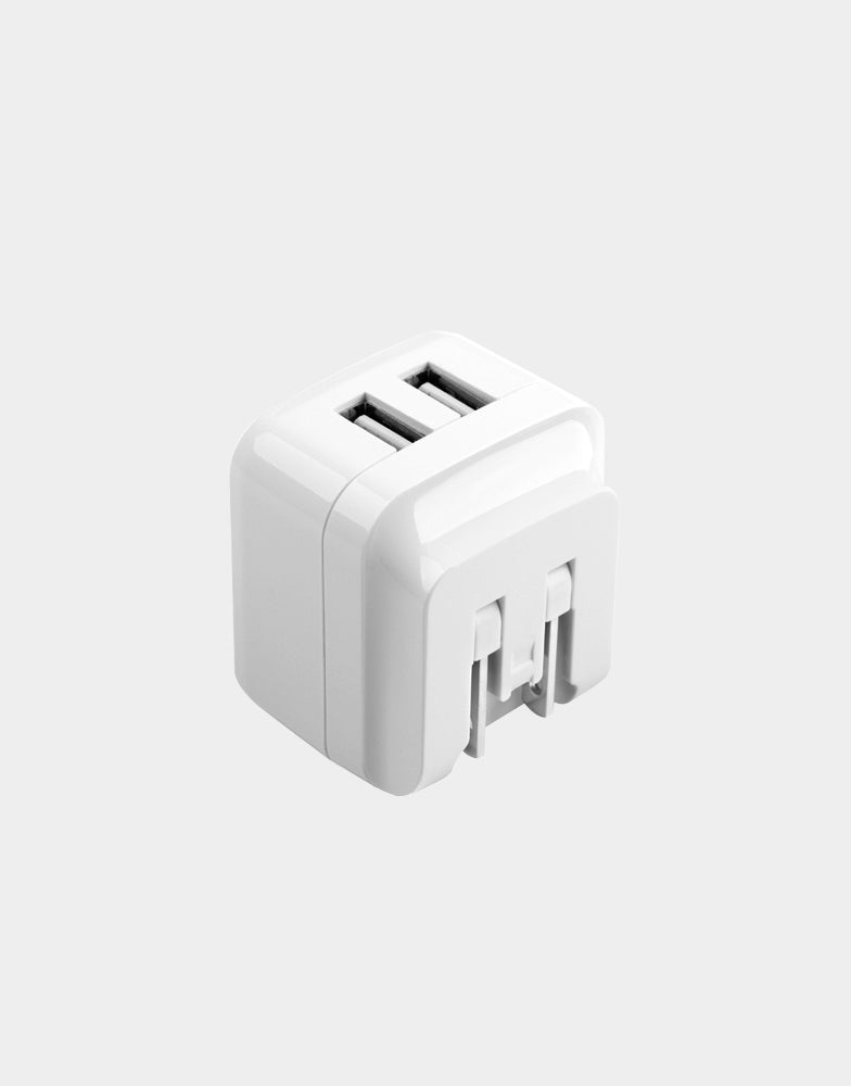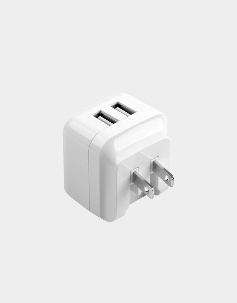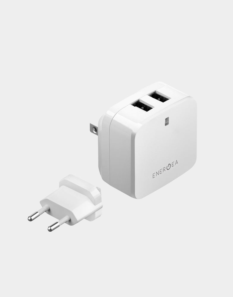 A compact 2-USB wall charger with compatibility in the US/EU or US/UK region (EU/UK plugs are separate snap-ons). Equipped with AMPSMART Technology that auto detects power needs of devices.