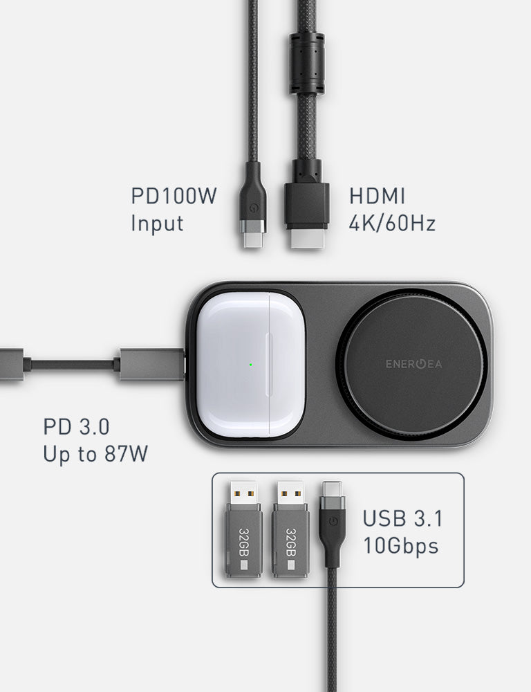 The WiDock Plus 7-in-1 is a sleek and versatile USB-C 3.1 dock with Qi2 and MagSafe compatibility for fast wireless charging of your phone and earbuds. It supports 4K 60Hz HDMI output, 10Gbps transfers via 1 USB-C and 2 USB-A ports, and doubles as an adjustable phone dock. It's the perfect all-in-one hub for a clean and modern workspace.